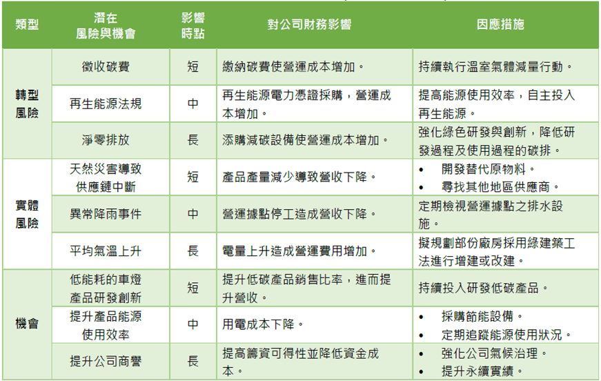 為監督氣候相關風險與機會,本公司於董事會下設「永續發展委員會」,每年定期召開會議擬定相關決策,並由高階管理層領導公司各部門執行相關事宜,依照氣候相關財務揭露(Task Force on Climate-related Financial Disclosures Recommendation, TCFD)的框架列舉在業務、策略和財務規劃上與氣候相關風險與機會的衝擊,並積極研擬解決方案,期望能降低氣候變遷帶來的營運與財務衝擊,提升組織氣候韌性