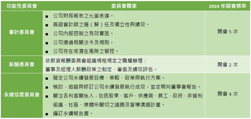 為強化公司治理、提升決策透明度與落實永續發展,本公司依據公司規模、營運特性及法規要求,設立多個功能性委員會,由董事會授權執行特定監督或決策職責,確保重大議題具備專業審議與風險控管機制。