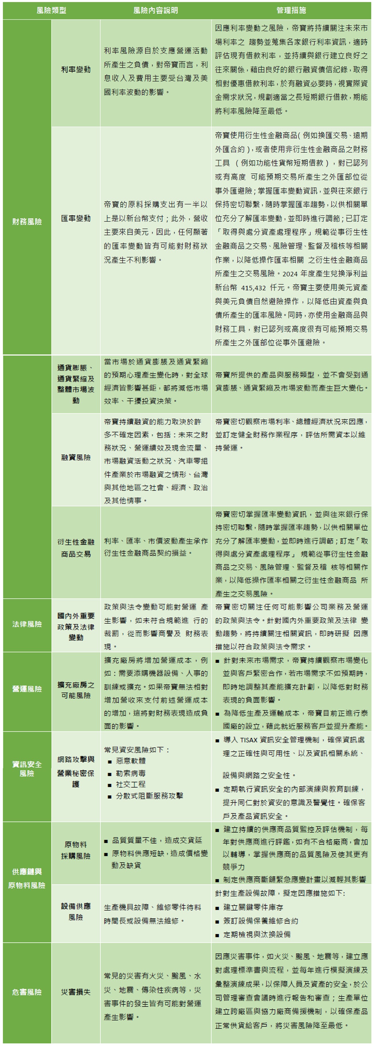 風險管理在營運中扮演著至關重要的角色,唯有有效應對各種風險,才能確保營運的可持續性和兼顧永續發展,為實現永續經營目標,由帝寶各部門進行市場、法律法規、技術和環境等因素帶來的風險評估,並根據風險內容提前制定應對方案。